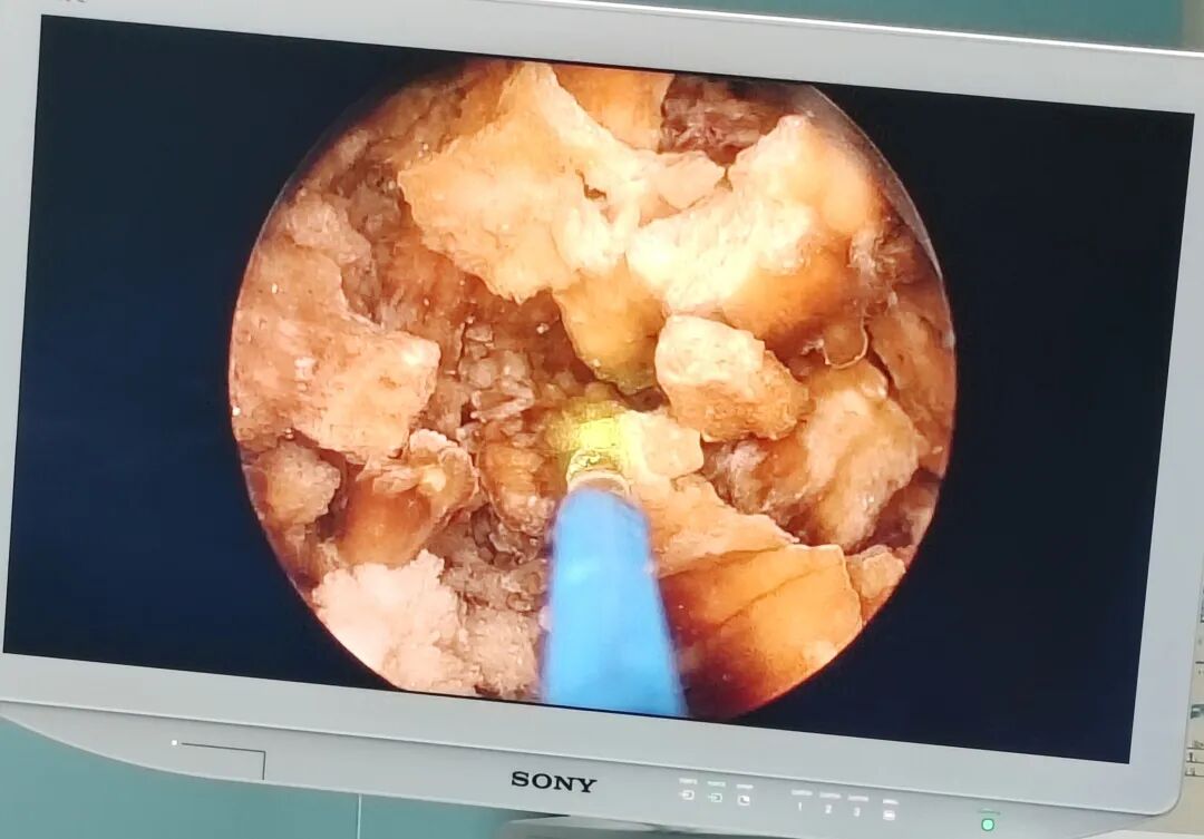 術中操作:醫(yī)生通過輸尿管內窺鏡定位結石后利用鈥激光擊碎結石。